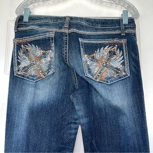 • Embellished back pockets with flap and snap detail. A few stones missing, but not obvious.