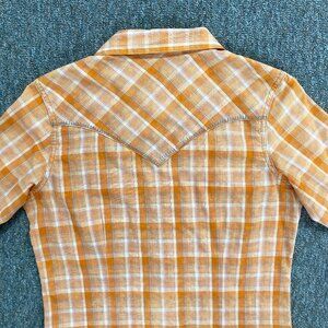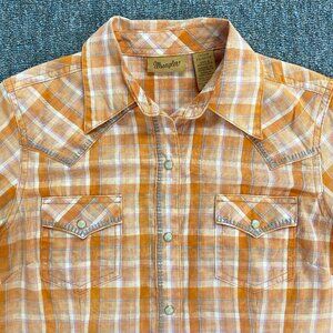 Orange/peach and white plaid Wrangler shirt. Classic country-western style with embroidered yokes on the front and back. Pattern is slightly mottled for a vintage, lived-in look.