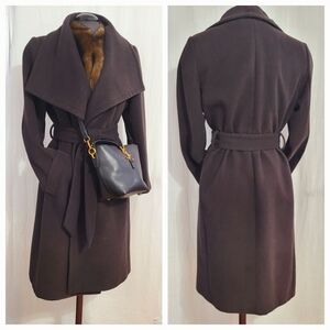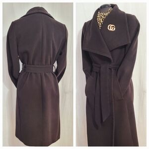 Chocolate Brown wrap coat with large shawl collar/ slant pockets /shoulders 17"/ sleeve length 24" /neck to hem 42"/ width across bust line 22 /just dry cleaned Tags says L use my measurements / first picture" stock pictures for overall LOOK "