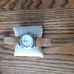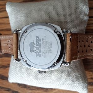 Rapp watch with leather wrist band. It needs new batteries. In great condition, no dents and no scratches. Mother of pearl facing and large numerals.