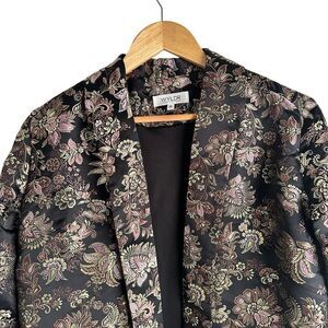 In excellent condition. Wyldr open cropped blazer in a gorgeous floral brocade patter. This is a great jacket for an evening out with a cropped length, a metallic sheen and a3/4 sleeves. Open with no closure and lined. Flat lay measurements: 17" pit to pit, 19" length.
