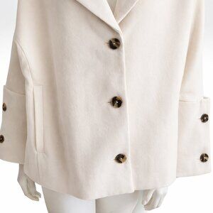 Beautiful and sophisticated Wynnelayers oversized jacket in a creamy soft beige tone. This piece features a modern, relaxed silhouette with wide sleeves, structured lapels, and statement tortoise-style buttons. The fabric has a smooth, luxurious feel with a clean, minimalist finish that elevates any outfit instantly.