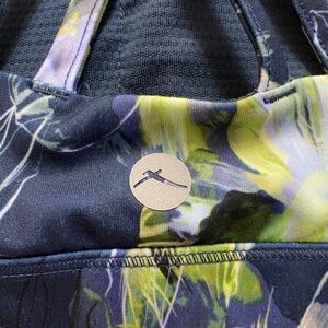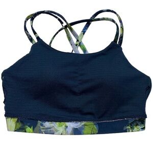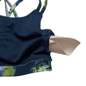 Features: Women's, crisscross strap sports bra, build in cups, peach skin collection, dark flower, floral, navy, blue, green, sporty chic, ultra supportive sports bra, fixed shoulder straps, no underwire, stretch construction, moisture wicking, quick drying, 4 way stretch, flatlock stitch, gottex studio technology, sporty, athletic, exercise, yoga, gym, workout