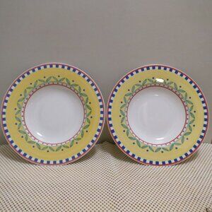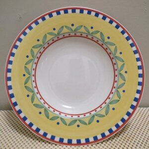 Elevate your dining experience with the contemporary flair of the Villeroy & Boch pasta/soup bowl set. Crafted in Germany between 1998 and 2004, this two-piece collection showcases a bold palette of blue, orange, yellow and green decorative bands, along with an eye-catching geometric shapes. The round bowl measure 9.5 inches in diameter and stand 1 7/8 inches tall, perfectly sized for a variety of occasions. Made from fine Vilbo china with a glossy finish, these bowls are a testament to the renowned craftsmanship of the Villeroy & Boch brand. The set is a versatile addition to your tableware, suitable for all occasions and designed to impress. Whether enjoying a casual pasta night or hosting a formal dinner, these beautifully designed bowls will surely enhance your culinary presentation