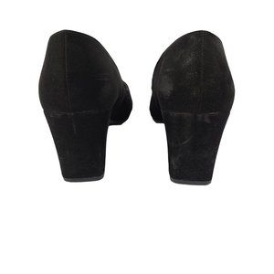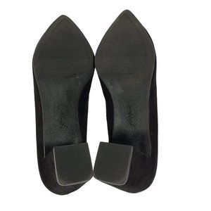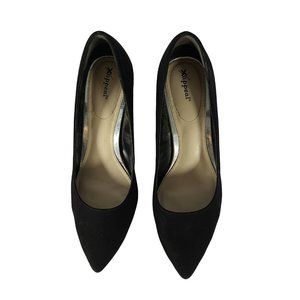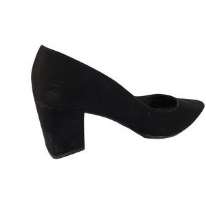 XAPPEAL "Amelie" style. Faux black suede with a block heel, which is approximately 3 inches high. Shoes have soft comfort strip attached to the back to avoid blisters. There are a few faint marks on the faux suede, but not enough to be seen when wearing the shoes.