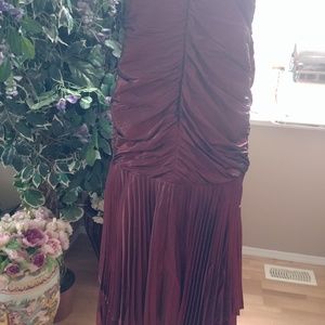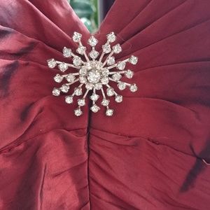 Photos don't do this prom dress justice. It is a shimmering red/burgandy, has a touched upper bodice with a drop waistline and an under crinoline. Size 12. It is accented with a shimmering brooch in the centre. Has spaghetti straps and a long zipper at the back for easy on and off dressing.