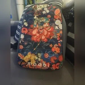 Vibrant backpack with floral and animal print. Features bold colors and unique design.