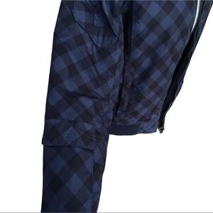 XDYE Clothing - Reversible Jacket with hood in blue and black check nylon and solid navy blue jersey sweatshirt material on the other side. Toggle cinch hood. Hood is not removable.