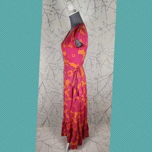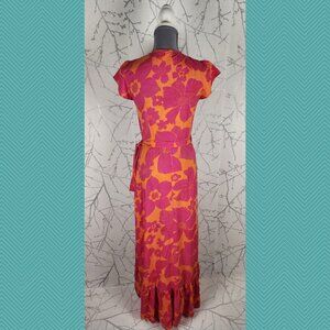 XIX Palms Orange Pink Floral Print Flounce Hem Maxi Wrap Dress