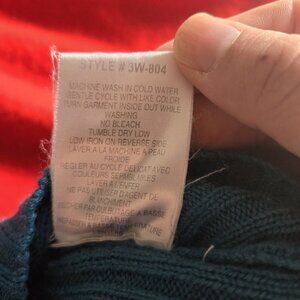 Offering a gently used teal blue v-neck sweater from Suzy Shier! It is made of 100% acrylic and is size XL. It has a cable pattern on the front. The sleeves and back of the sweater are ribbed. This combination makes for some intriguing visual interest! It is recommended to wash the sweater inside out in cold water on the delicate cycle.