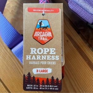 Arcadia Trails, X Large Rope Harness, Neck 22 - 34 in, Girth 28 - 40 in for maximum mobility. Easy step-in design, sleek style, adjustable fit, prevents over-tightening. One of them is missing small tags, both have larger tag.