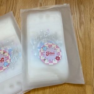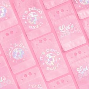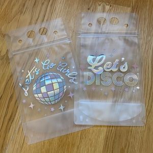 Disco themed, holographic print bachelorette party baggies to sip your drink out of. Pour a cocktail into a baggie, stick a straw in one of the holes up top, seal as far as you can, drink and go! Each bag holds 15oz of liquid. Package comes with 30 bags--10 of each design. 2 packages available. Never used, brand new. Comes in a big zip-top plastic bag. See last picture for how to use these. See second last photo for all 3 designs.