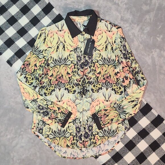 XS | Black Swan | Contrast Trim Floral Button-Up Blouse