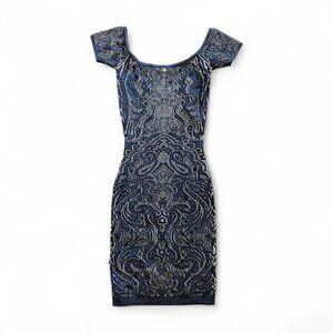 XS Guess Black Lace Bodycon Dress Brocade Knit Stretch Knee Length Black XS