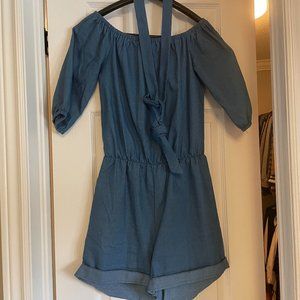 XS Jean Romper from Wish. Sits off the shoulders with belt around the waist. EXCELLENT condition - barely worn.