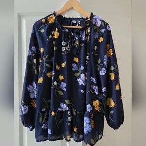 Elegant navy blue women's top featuring intricate eyelet detailing, balloon sleeves. Perfect for a chic and stylish look.