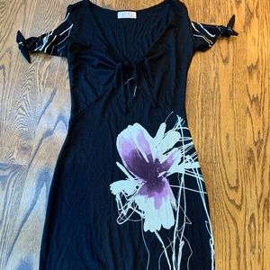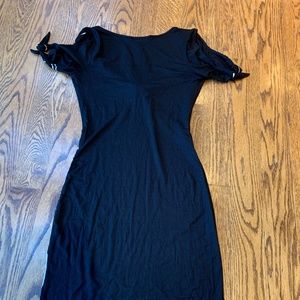 jersey knit easy to wash, easy to travel with cold shoulder dress. Dress has stretch and is in great condition. 15" shoulder to shoulder, 17" armpit to armpit, waist, 13 1/2", hips 14 1/2" length from top of shoulder to bottom is 35"