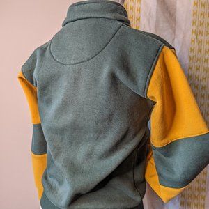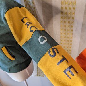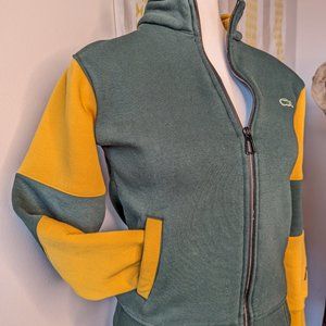 Vintage Lacoste zip-up sweater found secondhand in excellent condition. Size indicates it's boys' sizing (30), but style is unisex and could fit an XS girl or woman. Colours are beautiful green and yellow with 'LACOSTE' written down the left sleeve. Has pockets, soft interior. Fabrics unknown but feels like cotton.