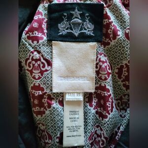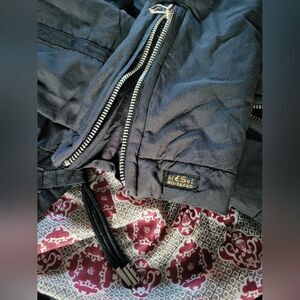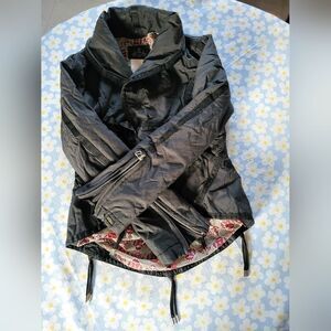 This stunningly chic black Authentic Diesel jacket with a high collar, emblem-lined interior, and minimal tassels, has a single-button and tie-off to securely close.
