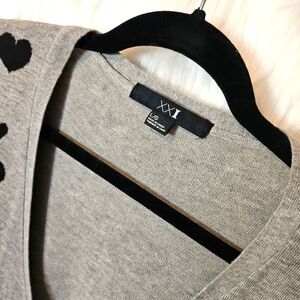 Adorable and affordable, this Forever 21 lightweight knit cardigan is a sweet addition to any wardrobe. Featuring playful black hearts on the front, this charming layering piece adds a touch of whimsy to your everyday look. New without tags, this gently handled cardigan is ready to wear. Perfect for casual outings, work, or school, its soft knit fabric and relaxed fit ensure comfort and style. Snag this cute and trendy find for a steal!
