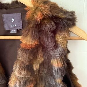 Plush and cozy faux fur vest in a gorgeous blend of earthy autumn tones like rich browns, warm oranges, and golden highlights. Features a textured, layered look that adds depth and dimension. Fully lined for comfort and easy layering and clasp closure on the front. In perfect pre-owned condition.