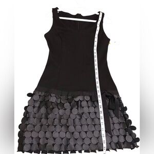 Sleeveless black mini dress with bow and vegan polka dots/ coins details.