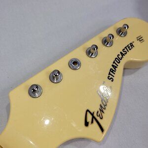 Xbox 360 Rockband 1 wired fender guitar controller with strap, in used shape as shown with some scuffing and scratches to the black areas and one of the small silver pins on the handle has broken off but doesn't affect use as they are just for show. Also has a fair number of the stickers applied to it. Includes the break-away cable and has been tested and in working condition. No game or packaging included, as shown.