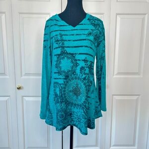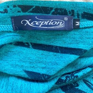 This Xception long sleeved tunic is a size medium. The shirt has black details with silver studs on the front. This shirt has long sleeves. The cut of this tunic drapes beautifully over the body. The Lycra/spandex ensures this tunic holds its shape and maintains the flounce shape. The bottom of the shirt has a flounce hem. This shirt has beautiful embellishments and details. It is versatile and can be worn with leggings or jeans. The colour of the shirt is vibrant and it is in very good condition.