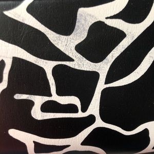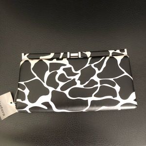 Xcetera black and white giraffe print evening purse with silver clasp. One inside pocket. Front has some staining as seen in last photo, not noticeable price accordingly. New, never used but in storage for some time.