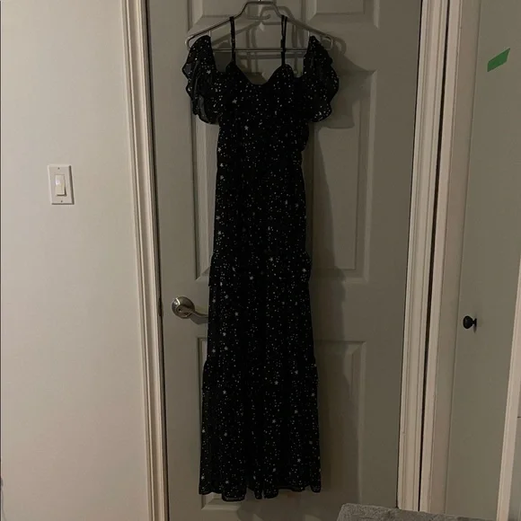 Chic black maxi dress with floral pattern. Features off-shoulder design and ruffle details. Perfect for casual outings or special events.
