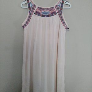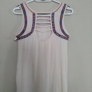 Eye catching, suave white dress with full lining. It is a size Large from brand XHILARATION. Top shell is cotton. The lining is polyester. Beautiful little mirrors with different colored threads line the neck and shoulder areas. Has a deep back with attached horizontal stripes.