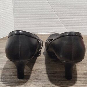 FEATURES/ACCENTS: 2" high heel. strap accents. Round toe. Comfort, cushioned footbed. Black color.