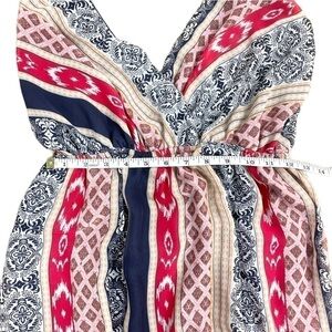 Feminine and flowy maxi dress by Xhiliration. the top is halter style, tying behind the neck. The inside of the dress is lined to just above the knee. the fabric has a light, breezy, chiffon feel and the waist band is elastic. Excellent condition, size medium.
