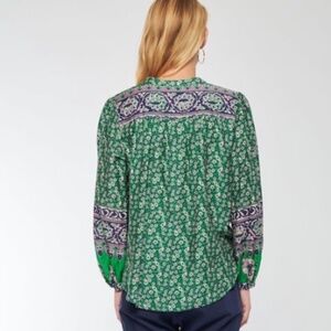 Vibrant green blouse with floral pattern. Features buttoned neckline and long sleeves. Perfect for casual wear.