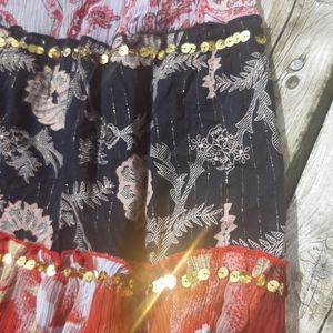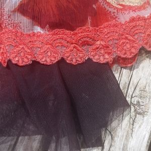 Too cute! This skirt features multiple layers and textures. Denim waist with rivets, gold embellishments, lace and tulle. Side zipper. Cotton/spandex material, a few gold embellishments missing. 17" waist lying flat and 30" total length.