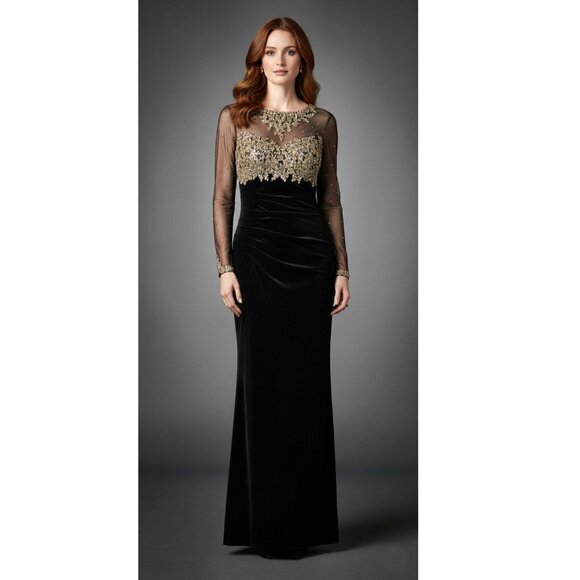 Xscape Beaded Illusion Bodice Velvet Evening Gown, Black & Gold, Womens Size 2