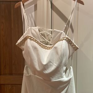Details: Strapless, Cut Out on Side and Back, Lace Up Back, Gold Trim