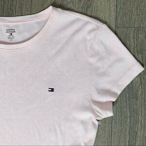 Women's early 2000s y2k Tommy Hilfiger Pale Pink Logo Short Sleeve Cotton T-Shirt.