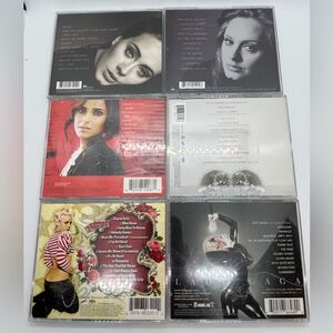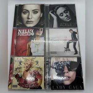 Collection of six CDs featuring Adele, Nelly Furtado, Justin Timberlake, Pink, and Lady Gaga. Iconic albums with diverse music styles.