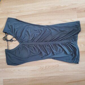 Light and stylish army green ruched top. Cannot read the exact brand name but its depicted in a photo.