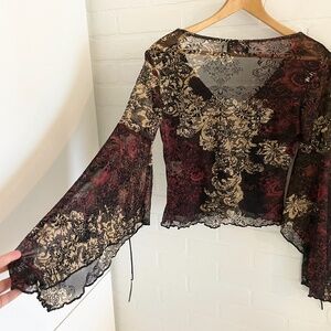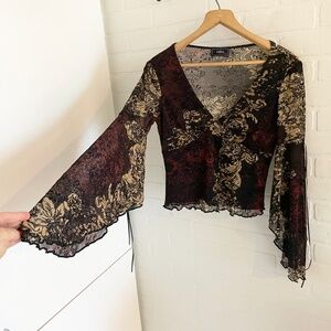 Y2K Babydoll Top Sheer Flare Sleeves Whimsigoth Dark fairy Burnt Velvet M