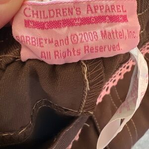Barbie shorts in a brown colour with pink stitching. Cute logo on the front and some accent buttons. Very nicely made! Tag from 2008.