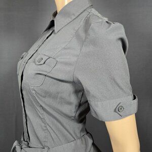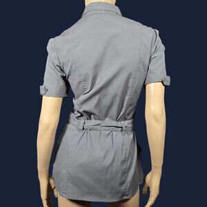 Y2K Belted Button Up Shirt Blouse Size M Grey Fitted Short Sleeve Utility Grunge