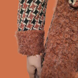 Y2K Belted Mid Length Houndstooth Coat Rust Brown Black Fuzzy Trim Size S
