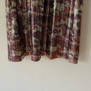 A true Y2K moment!! This Betsey Johnson mini dress is decked out in shimmering pink, gold, and silver sequins over an army print, flattering silhouette, stretchy lining for comfort, a racerback, and a metallic sheen that catches every bit of light. Wear it with heels or over a baby tee for full early 2000s It-Girl vibes. It excellent pre-owned condition.