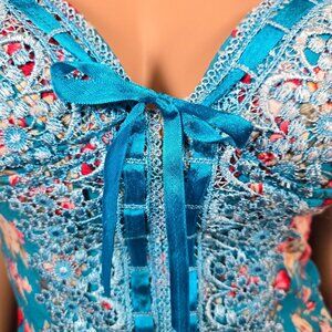 Y2K Blue Floral Lace Bustier Top Ribbon Bow Size M Fairy Feminine Coquette