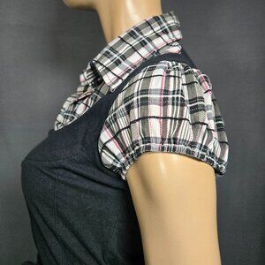Y2K Button Up Blouse Top Size L Black White Plaid Short Sleeve Stretch Tie Back
