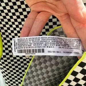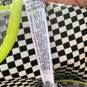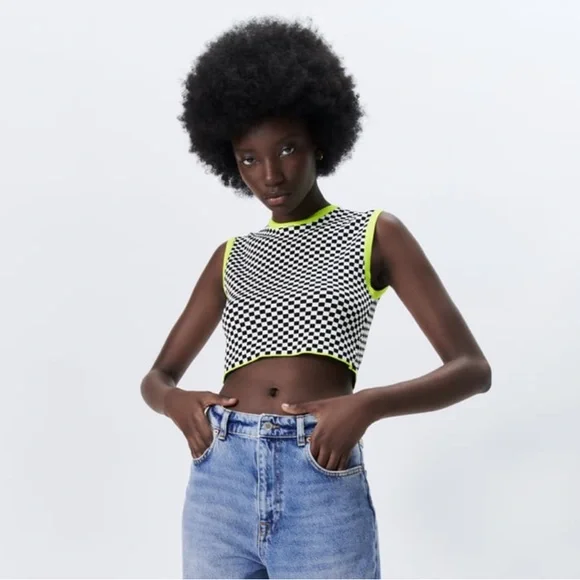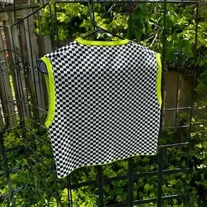 Woven, check crop top with lime green accents. Bust: 18” Waist: 16.5” Length (inner shoulder seam to hem): 17.25”