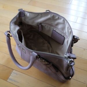 Soft pale purple color leather, there are 2 small pockets on one side and one zipped pocket including a beautiful embossed Coach leather piece explaning its craftsmanship. Measures approximately 15”w x 11”H x 4” D