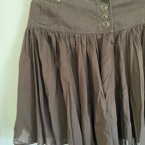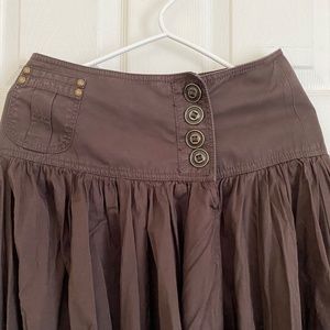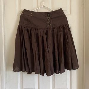 Chocolate coloured flounce and details on a wide waistband make this skirt stand out. Good for fall, spring and winter with warm tights and boots. It can also be casual or dressy.